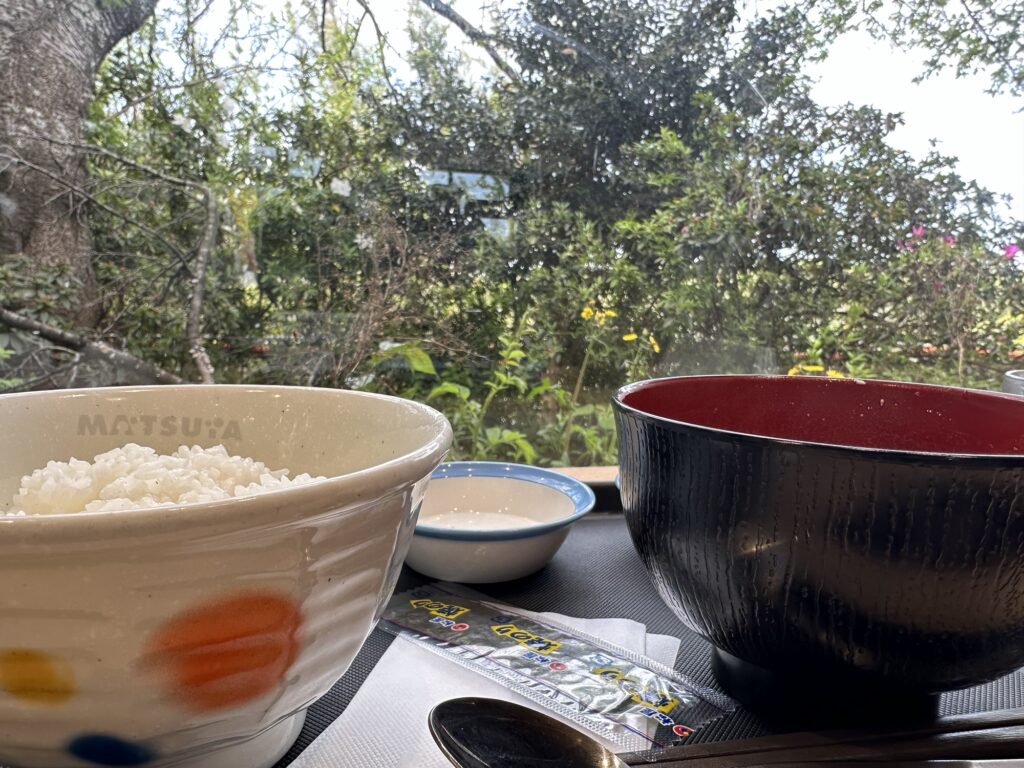 ごはん、納豆、海苔、お漬物、そして豚汁。