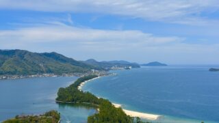京都府北部、日本海の宮津湾にある『天橋立』は、陸奥の『松島』・安芸の『宮島』とともに、日本三景とされている特別名勝のひとつです。幅は約20~170m・全長約3.6kmの砂嘴(さし)でできた砂浜で、大小約8000本もの松が茂っている珍しい地形で、その形が、天に架かる橋のように見えることから『天橋立』の名が付きました。
